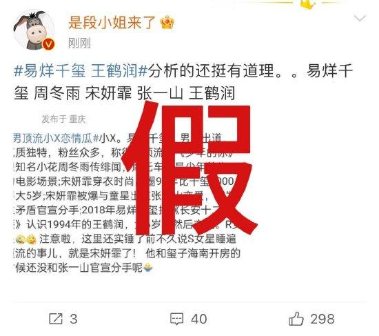7月7日,八卦媒体爆料男顶流的三段恋情,有网友猜测分别是易烊千玺和周冬雨、宋妍霏、王鹤润,引发热议。随后,宋妍霏工作室发文辟谣:“关于宋妍霏女士的内容纯属无中生有,内容均为假!无稽之谈!”王鹤润工作室也表示:“不实消息,请勿传谣,谢谢! ”