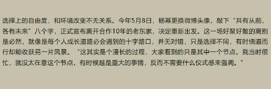 在采访中,杨幂谈到今年5月8日换头像并用“共有从前,各有未来”八个字正式宣布离开合作10年的老东家嘉行一事,表示“这其实是个漫长的过程,大家看到的只是其中一个节点。我当时很忙,就没太在意这个。