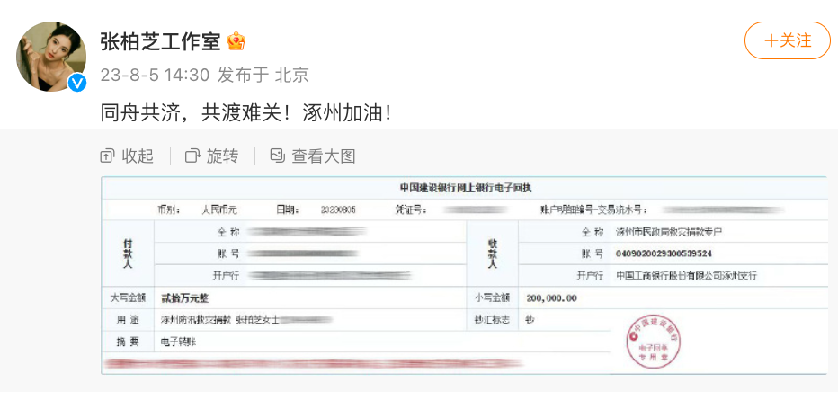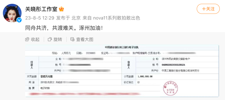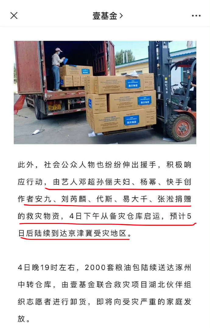 组图:驰援涿州!关晓彤张柏芝向灾区捐款 杨幂邓超孙俪捐赠物资