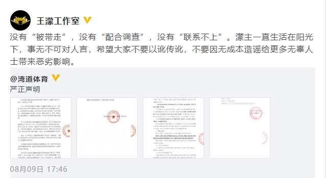 随后。王濛工作室也转发声明并表示王濛没有被带走配合调查,也没有联系不上。