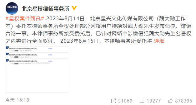 15日,北京星权律师事务所公布案件简讯,称魏大勋工作室委托律师事务所全权处理部分网络用户持续对魏大勋先生发布侮辱、诽谤言论一事,律师事务所已针对网络中涉嫌侵犯魏大勋名誉的内容进行全面取证,并将相关用户起诉至法院。