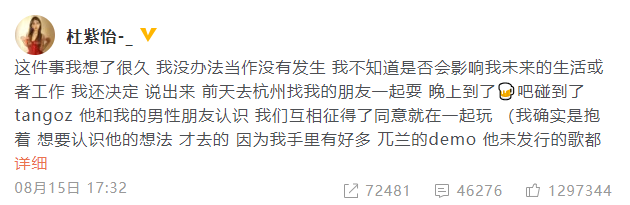 8月15日,《青春有你2》选手杜紫怡曝tangoz性骚扰,称前天在酒吧碰到Tangoz,他酒后当众对自己进行言语侮辱,也没有道歉,随后他女朋友一直捂着他的嘴表示是他喝多了。