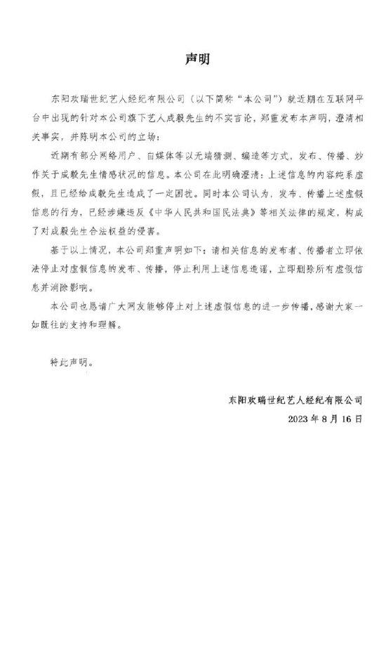8月16日,有网友发现成毅[微博]、吴施乐行程重合,引发对两人恋情猜测。对此,成毅经纪公司欢瑞经纪发文回应,称近期有部分网络用户传播关于成毅情感状况的信息,公司在此明确澄清相关内容纯系虚假,希望相关传播者立即删除所有虚假信息并消除影响。