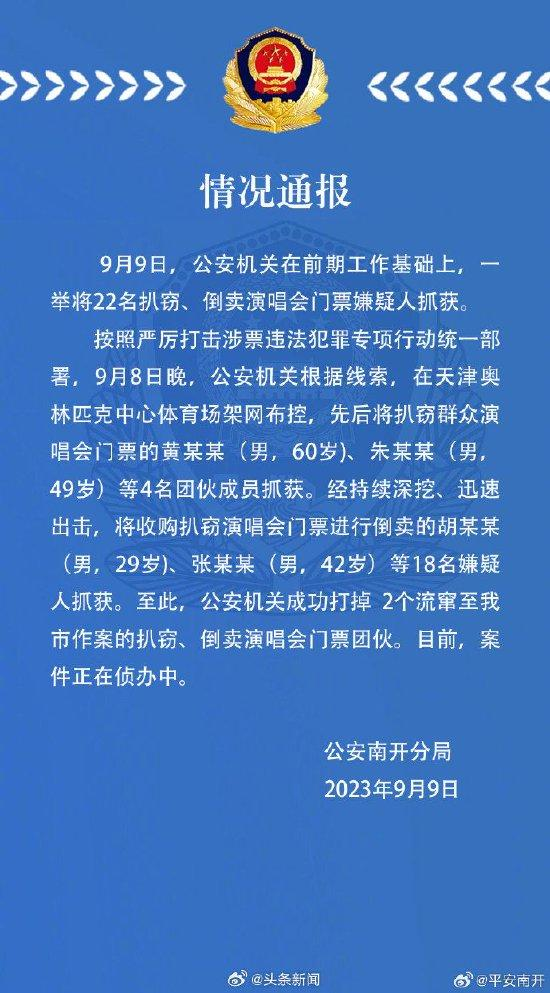 据平安南开通报:9月9日,公安机关在前期工作基础上,一举将22名扒窃、倒卖演唱会门票嫌疑人抓获。
