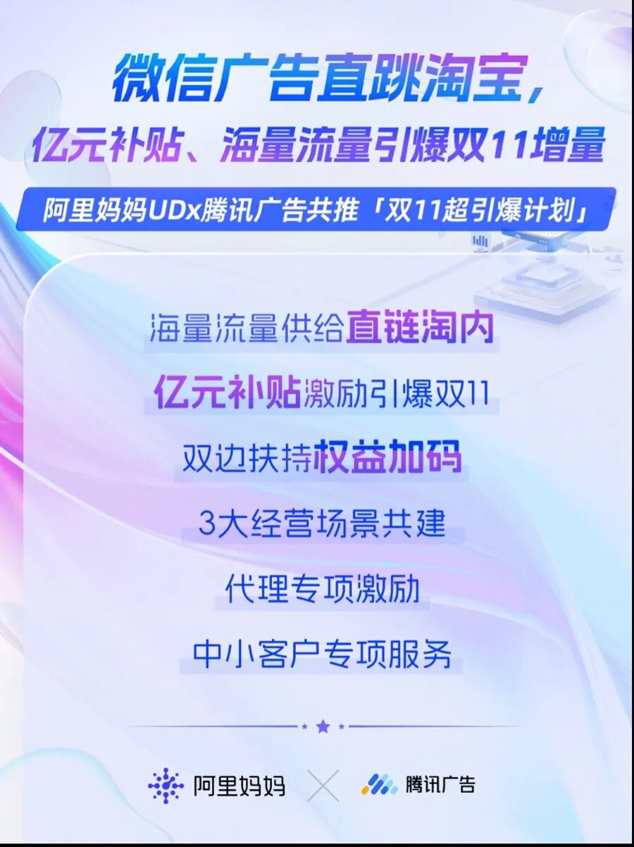 不久前,阿里妈妈与腾讯广告进一步深化合作:微信视频号、朋友圈、小程序等优质广告流量通过阿里妈妈UD(全域媒体营销平台)效果投放,可直跳淘宝、天猫商家的店铺、商品详情及淘宝直播间。双方将共同启动“双11超引爆计划”,投入亿元补贴及多项权益,满足商家“引流到店、购买成交、直播引流”的大促目标。同时,双方还将在人群互补、系统共建等方面,展开深度融合,满足商家在店铺、直播、内容三大经营中心的不同经营目标。