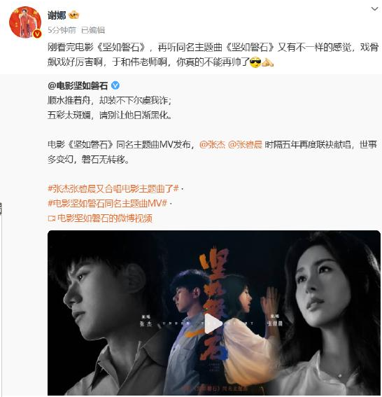 近日,张杰为电影《坚如磐石》演唱主题曲,妻子谢娜转发微博打call:“刚看完电影《坚如磐石》,再听同名主题曲《坚如磐石》又有不一样的感觉,戏骨飙戏好厉害啊,于和伟老师啊,你真的不能再帅了。”
