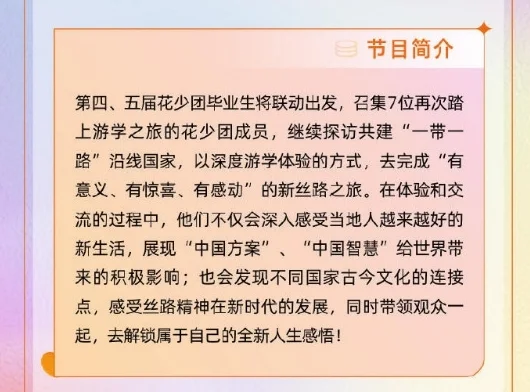 此外根据《花儿与少年6》节目简介,这季节目中第四、五季花少团毕业生将联动出发,召集7位再次踏上游学之旅的花少团成员,继续探访丝路国家。