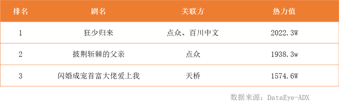 根据DataEye热剧排行榜,5月第四周,排行前三的短剧分别是:《狂少归来》、《披荆斩棘的父亲》、《闪婚成宠首富大佬爱上我》。