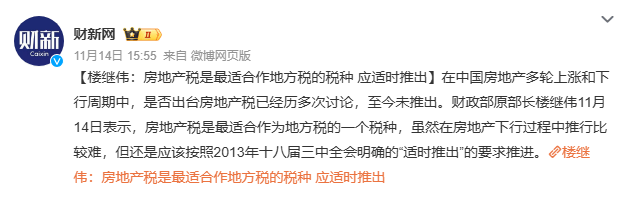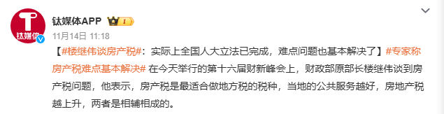 早在2023年初,楼继伟曾发表了题为《新时代中国财政体系改革和未来展望》的文章,其中指出,房地产税是最适合作为地方税的税种,在经济转为正常增长后应尽快开展试点。当时,有业内人士认为,这说明作为土地财政转型方向、调节收入和财富分配的重要手段之一,房地产税的落地是大势所趋。4月25日,自然资源部部长王广华在全国自然资源和不动产确权登记工作会议上宣布,我国全面实现不动产统一登记。这一消息也在网络上引发了有关房地产税、楼市动向等方面的猜想。