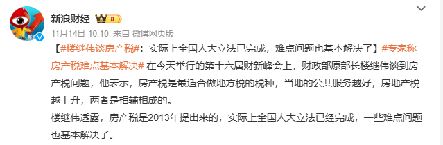 随后,楼继伟在峰会上的发言引发广泛热议。多个媒体援引财新网的报道称,“楼继伟谈房产税:实际上全国人大立法已完成,难点问题也基本解决了”;有网友表示很久未听到“房地产税”的消息了,很期待,不过当前房地产形势估计很难立马推出;专家马光远则表示一个退休的官员在公开论坛谈及房地产税立法进展不合适。