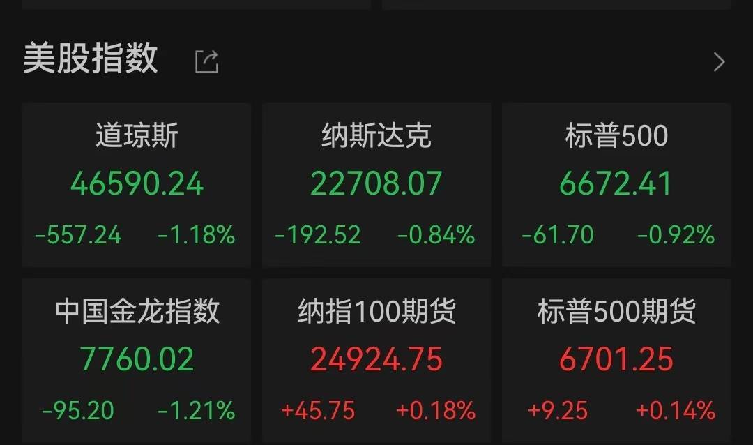 大型科技股多数下跌,美光科技跌近2%,英伟达、苹果跌超1.8%,Meta跌1.2%,特斯拉涨1.1%。