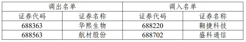 科创50指数本次更换2只样本,翱捷科技、盛科通信调入指数样本,华熙生物、航材股份调出指数样本: