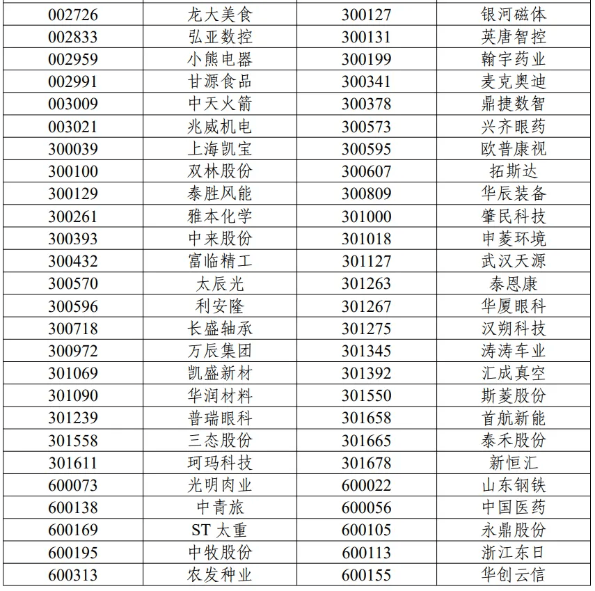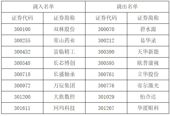 创业板指数本次更换8只样本,双林股份、常山药业、富临精工、长芯博创、长盛轴承、万辰集团、大族数控、珂玛科技调入指数样本,碧水源、易华录、天花新能、欧普康视、立华股份、帝尔激光、怡合达、华厦眼科调出指数样本:
