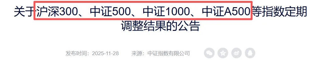 11月28日,中证指数、上交所、深交所官网同日公告:将调整沪深300、中证A500、上证50、科创50、中证500、中证1000,以及创业板指、创业板50等指数样本。