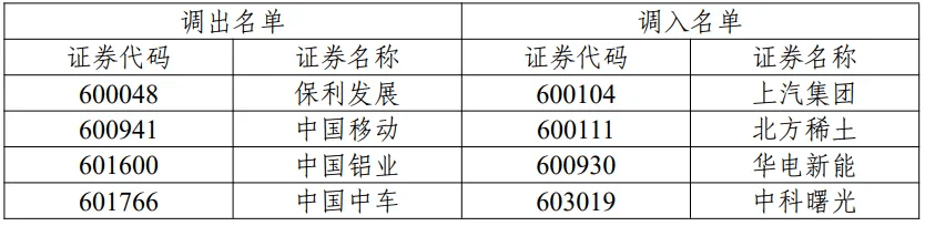 上证50指数本次更换5只样本,上汽集团、北方稀土、华电新能、中科曙光调入指数样本,中国移动、保利发展、中国铝业、中国中车调出指数样本: