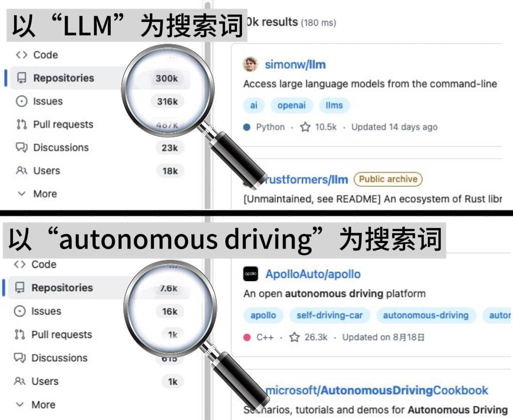在GitHub网站上,以 "LLM" 为搜索词,代码仓库(通常反映开源项目规模、活跃度)为30万,而以“autonomous driving”为搜索词,代码仓库不到1万,二者之间差距接近40倍。