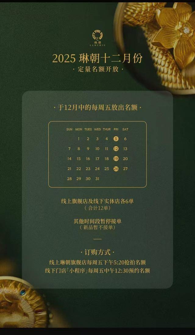 除了奢侈品定价策略,老铺黄金的“稀缺性”营销也被复制。老铺黄金通过严格控制门店扩张速度来维持稀缺性。公司主要采用直营模式,在全国仅有41家门店,选址严格限于SKP、万象城等顶级商场。而琳朝珠宝则坚持更极致的手工原创设计,其天猫门店所有产品长期都处于预售状态,客服向记者表示,公司每周五只接受12个新订单,线上线下同步抢订,而每个订单的工期则长达12个月。