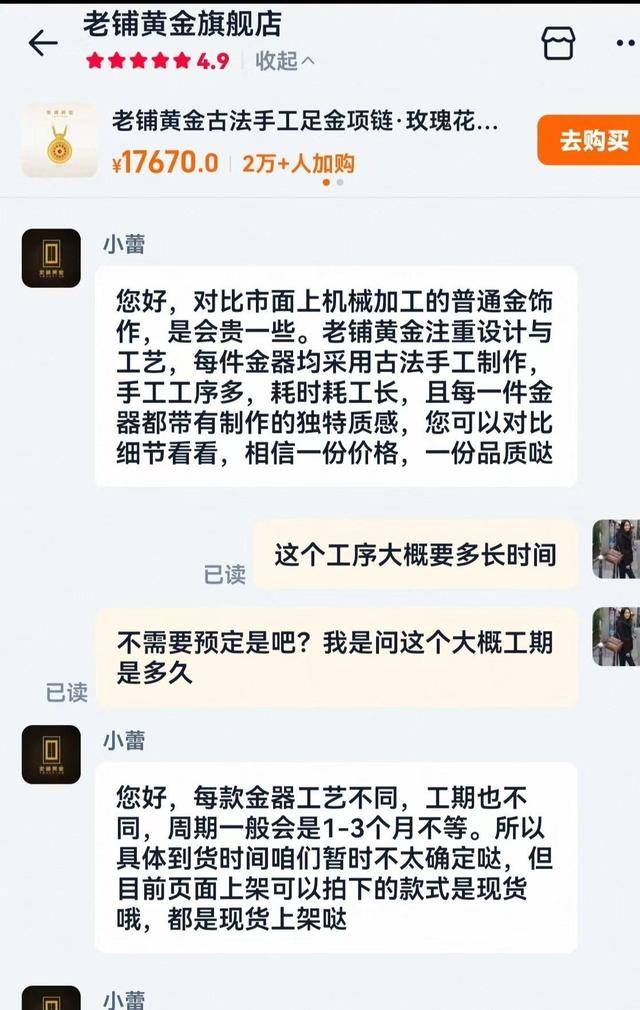 “目前饰品把件类全是一口价,每件均采用古法手工工艺,周期在1-3个月不等,其质感独一无二,价格自然比机械加工的普通金饰要贵。”当记者询问一款克重均价为何高达2265元的玫瑰花窗钻石镶嵌吊坠时,老铺黄金天猫客服这样解释。